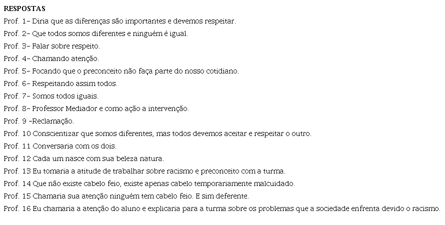 Dando sequência à análise, foi lançada às professoras uma questão hipotética: “na sala de aula, o que você faria se um (a) estudante chamasse o cabelo da outra (o) de feio”?