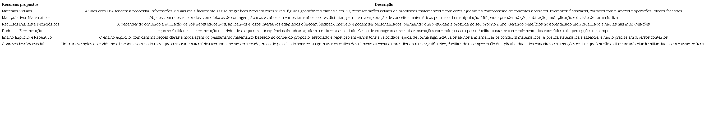 Portanto, a aquisição do conhecimento matemático associado as habilidades e competências por alunos autistas pode ser “facilitada” através da ampla utilização de recursos e estratégias pedagógicas que promovam a acessibilidade e a compreensão conceitual. Na literatura, estudos indicam que abordagens multimodais, adaptadas às características cognitivas dos autistas, são fundamentais para o sucesso no aprendizado. No quadro abaixo (Quadro 1), apresentam-se alguns recursos que podem ser eficazes para alunos do 3º ano.