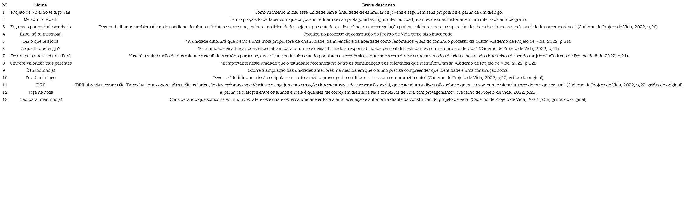 É um documento de 75 laudas que apresenta, inicialmente, algumas nuances do contexto da Reforma do Ensino Médio via Lei nº 13.415, de 2017, avançando para questões sobre Projeto de Vida no Pará com uma proposta de construção de futuro, além de uma base de plano de trabalho docente. Consideramos como diferencial as 13 unidades que fazem parte do anexo do documento nomeadas a partir de palavras da cultura paraense, provavelmente com a intenção de aproximar o aluno da proposta local (Caderno de Projeto de Vida, 2022).