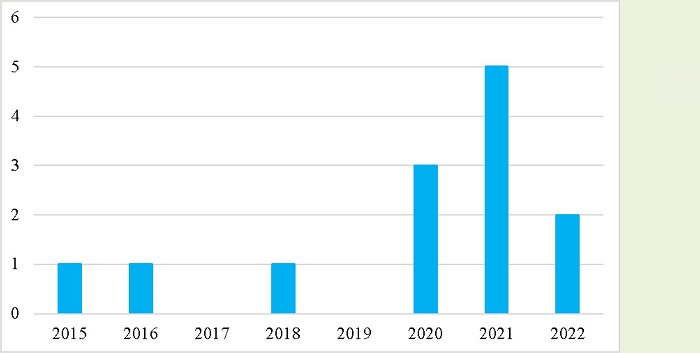Por isso, encontramos artigos sobre o assunto em 2015, ano em que o MEC disponibilizou a primeira versão do documento e um artigo em 2016. Não foram publicados, na plataforma pesquisada, nenhum artigo nos anos de 2017 e 2019. Apenas um em 2018, contudo, os estudos se intensificaram, e identificamos, a partir desse período, três publicações em 2020. O ano de maior publicação foi 2021, com cinco artigos. Mais dois artigos foram publicados em 2022, como evidencia o gráfico 1.