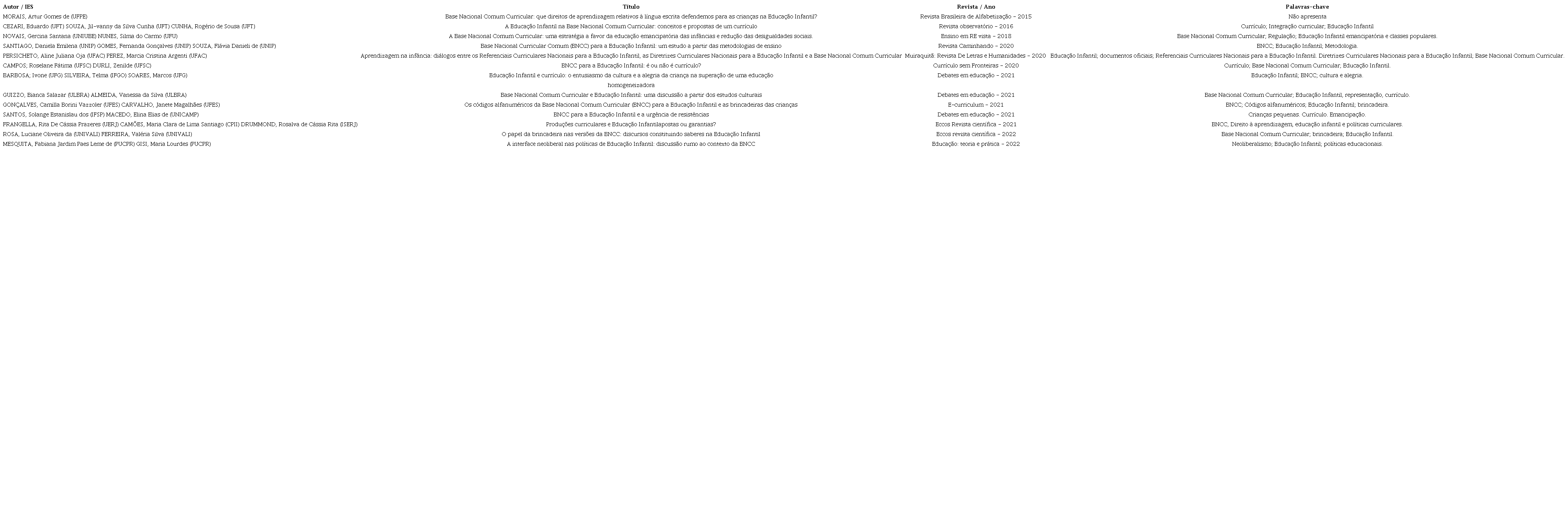 Como critério de inclusão, foram considerados os artigos revisados por pares, cujo teor apresentava discussões referentes à BNCC da Educação Infantil como documento organizador do currículo dessa etapa da educação básica. Foram excluídos os que apresentavam abordagens da BNCC de outras etapas da educação, discussões de aspectos específicos da BNCC da Educação Infantil como, por exemplo, relações étnico-raciais, culturais e de gênero. Da mesma forma, excluímos os que tratavam do currículo de determinados municípios. Essa exclusão foi necessária para que pudéssemos focalizar a análise da BNCC enquanto documento normativo de forma mais ampla.