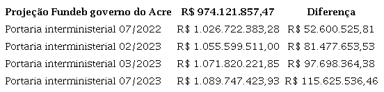 Amparados pelos dados acima, é possível dizermos que a rede pública estadual de ensino comprometeria 83,22% de suas receitas para Manutenção e Desenvolvimento do Ensino (MDE) com pagamento de pessoal. Mas, diferentes questionamentos podem ser feitos à esta assertiva. Não esqueçamos, por exemplo, que a Lei nº 14.113/2020, que regulamenta o Fundeb, determina a atualização das estimativas de receitas destes fundos contábeis a cada quatro meses, ao logo do exercício de referência (Brasil, 2020). Quando este aspecto é considerado, percebe-se que a previsão de recursos oriundos desta fonte apresentada pelo governo do Acre, é inferior a todas as estimativas para 2023, publicadas em portarias do Ministério da Educação (MEC) e do Ministério da Fazenda (MF).
