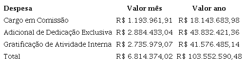 Convém informamos a metodologia utilizada para projetarmos as despesas com a folha de pagamento dessas categorias. Ao multiplicarmos o total de profissionais posicionados em cada classe e referência pelo valor do vencimento correspondente, encontramos o custo mensal de R$ 25.037.932,20. Para dimensionarmos a despesa anual, multiplicamos este montante por 13,33 (12 meses de vencimentos, décimo terceiro salário e férias), acrescentando na sequência o percentual de 14% (encargo patronal praticado no Acre para profissionais do quadro permanente). O valor encontrado foi de R$ 380.575.618,06. Ressaltamos que não incorporamos nos cálculos as despesas resultantes de gratificações/adicionais que compõem as remunerações, pois as informações disponibilizadas pelo poder público não especificavam as categorias que as recebiam/recebem.