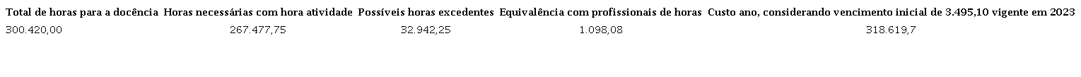 Como parte do varadouro metodológico escolhido para esta pesquisa e escrita, subtraímos o total de horas contratadas para o exercício da docência, do total de horas necessárias para que a rede de ensino supra as necessidades decorrentes da organização da oferta. Observamos, então, a possibilidade de 32.942 horas estarem excedentes. Ao fazermos a equivalência, vimos que corresponde, por exemplo, a 1.098 profissionais com graduação em licenciatura e jornada de trabalho de 30 horas semanais a um custo anual de de R$ 57.318.619,70, considerando o PSPN de R$ 3.495,10 praticado em 2023, pagamento de férias, décimo terceiro e encargos patronais.