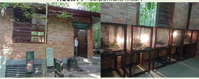 O serpentário, Casa das Serpentes, foi fundado em 2015 em parceria com a Fundação de Medicina Tropical Doutor Heitor Vieira Dourado (FMT-HVD). Consiste em uma construção cujo acesso é via uma trilha em meio a mata e conta com painéis, textos explicativos, esqueletos e réplicas de serpentes, espécimes expostos em recipientes de vidro fixadas em formol e animais vivos expostos em terrários , dentre eles, aBothrops atrox (jararaca-do-norte), Boa constrictor (jiboia), Epicrates cenchria (jiboia-arco-íris), Corallus hortulanus (suaçuboia), Oxybelis fulgidus (cobra-cipó) e Spilotes sulphureus (papa-pinto). Externamente à construção, há um terrário de grande porte a céu aberto, onde é exibida outra B. constrictor (jiboia) de grande porte. Em cada terrário há uma legenda que indica os nomes popular e científico da serpente, tamanho, estimativa de vida e sua classificação quanto a ser peçonhenta ou não. Mediadores ficam disponíveis na sala em tempo integral, para atender o público visitante. Os principais objetivos do viveiro são a educação, a pesquisa biotecnológica e a divulgação científica (MUSA, 2024a).