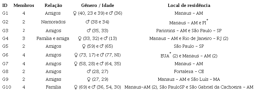 O convite para participar da pesquisa ocorreu por meio do contato das pesquisadoras com os visitantes, no momento em que chegavam à exposição. A coleta de dados foi realizada no dia 09 de junho de 2023, com 28 adultos e um adolescente de 13 anos, organizados em 10 grupos. Na tabela 1 podemos observar as características de cada grupo que aceitou participar da pesquisa.