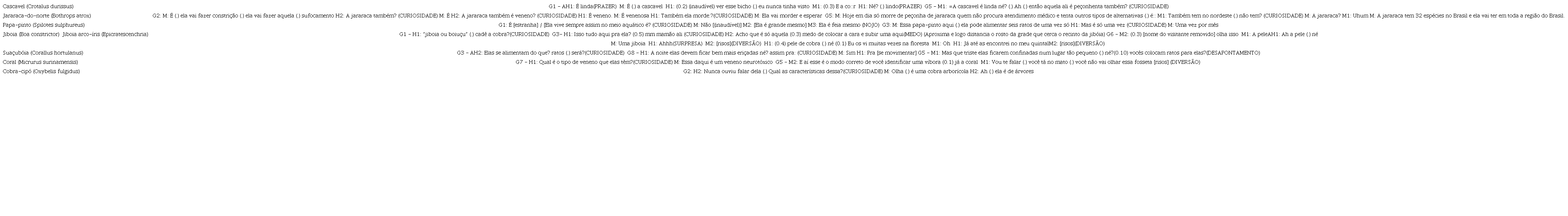 Neste item buscamos entender se houve algum agrupamento por valência (positiva / negativa) em relação às espécies nas conversas e interações dos grupos visitantes. Consideramos aqui apenas as conversas que traziam evidências de que o comentário era relativo a determinada espécie. Identificamos que a espécie cascavel (Crotalus durissus) despertou apenas emoções positivas, incluindo prazer (n=2), excitação (n=2) e curiosidade (n=1). A jararaca-do-norte (Bothrops atrox) teve apenas a emoção positiva de curiosidade (n=9) presente nas conversas. A espécie de papa-pinto (Spilotes sulphureus) foi associada a emoções positivas de curiosidade (n=4) e diversão (n=3) e a emoção negativa do nojo (n=1). A jiboia e jiboia arco-iris (espécies: Boa constrictor e Epicrates cenchria) despertaram mais emoções positivas (n=22) do que negativas (n=1). Entre as emoções de valência positiva foram recorrentes a curiosidade (n=18) e diversão (n=4), e a emoção negativa foi o medo (n=1). Além disso, a emoção surpresa, de valência neutra, foi identificada uma vez. Para a espécie suaçuboia (Corallus hortulanus) foram observadas as emoções de curiosidade (n=12) e diversão (n=5) como positivas e o desapontamento (n=1) como negativa. Quanto à coral, há duas espécies, a verdadeira (Micrurus surinamensis), em exibição em vidros com formol (morta), e a falsa (Lampropeltis triangulum), viva, exposta num terrário. Ambas despertaram as emoções positivas de curiosidade (n=6) e diversão (n=3). Por fim, a cobra-cipó (Oxybelis fulgidus) despertou a emoção positiva da curiosidade (n=1).