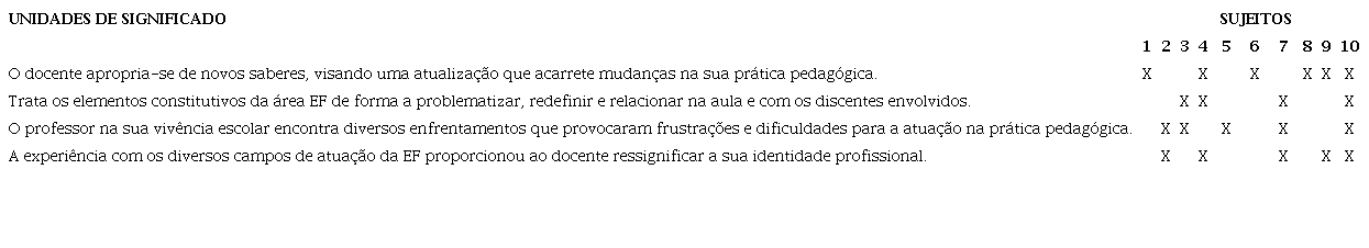 Por fim, a quarta unidade de significado diz respeito à experiência com os diversos campos de atuação da EF proporcionou aos docentes ressignificar a sua identidade profissional, situações observadas nas entrevistas 2, 4, 7, 9 e 10. Nessa unidade, nota-se que a partir das experiências vividas no campo de atuação, foi preciso repensar a identidade profissional, buscando uma prática que o foco estivesse na aprendizagem dos alunos, tendo em vista a superação das dificuldades enfrentadas no campo escolar.