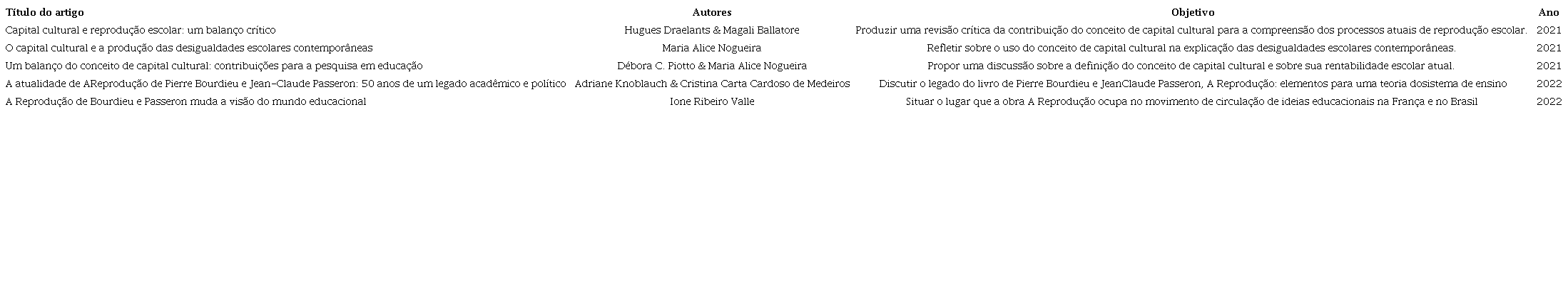 Respeitando os filtros propostos, foram identificados e inclusos 37 estudos. A partir desse quantitativo de artigos, selecionamos os trabalhos que apresentavam menções ao conceito de capital e à obra A Reprodução no título e no corpo do artigo de forma abrangente. Além disso, elegemos um outro recorte: optamos por estudos cujo escopo era questionar a prerrogativa segundo a qual a obra A Reprodução e o uso do conceito de capital cultural são ainda centrais na explicação das desigualdades escolares contemporâneas. Seguindo esse percurso metodológico, chegamos a 5 artigos. Eles servirão como base para a elaboração de nossa revisão narrativa de literatura e estão detalhados no Quadro 1 (abaixo).