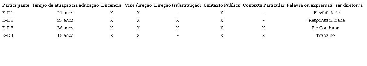 Em relação aos/as 4 participantes das entrevistas, todos/as ingressaram, como diretores/as, nas escolas públicas estaduais no ano de 2018. Todos/as tiveram experiências na docência, na coordenação pedagógica, na vice direção, antes de atuarem na direção escolar. A experiência variou de 15 a 36 anos.