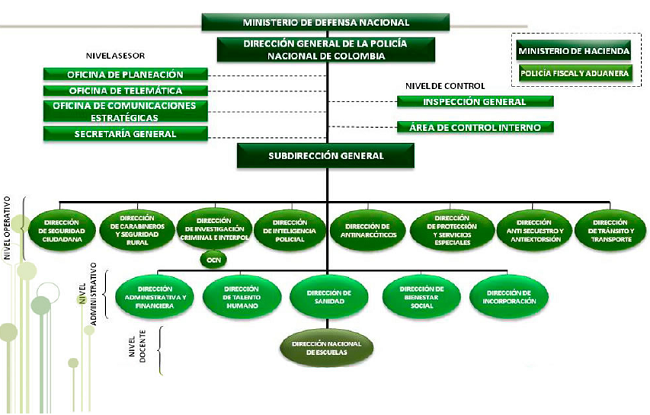 La PONAL, organizativamente es una institución que responde a las exigencias y estándares de la gestión pública del país, conforme se observa en el Gráfico 1, que ayuda a que los lectores comprendan mejor el lugar de la Dirección Nacional de Escuelas, objeto de este numeral 2.28