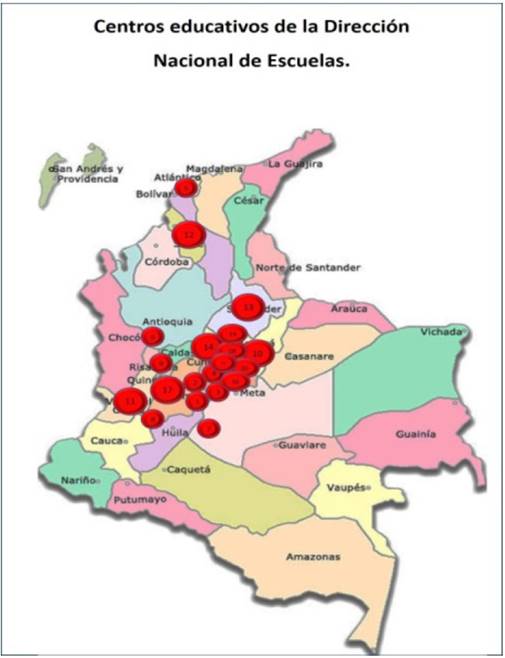 En cuanto a la cobertura territorial de las 21 escuelas en el país, ocho, que equivalen a 38%, están en Cundinamarca y Bogotá, es decir en el Centro del país. Las 13 escuelas restantes están ubicadas en diez de los 32 departamentos del país. En conclusión, el Sistema Educativo está concentrado en 11 Departamentos que representan 34% del territorio. Esta distribución se observa en el mapa en el que se georreferencia la información (Gráfico 2).