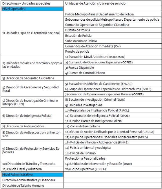 En ese contexto, la Policía Nacional de Colombia (PONAL), uno de los cuatro cuerpos de la fuerza pública y objeto de estudio en este ensayo, ha sido el organismo más afectado en su estructura institucional debido al encargo de atender las violencias del conflicto interno y demás acciones emergentes, como la administración del sistema penitenciario y carcelario. Como se observará en el Cuadro 1. la PONAL tiene más de 20 áreas de servicios especializados, la mayoría de carácter coercitivo5 y pocos preventivos para el mantenimiento de las “condiciones necesarias para el ejercicio de los derechos y libertades públicas y para asegurar que los habitantes de Colombia convivan en paz” (Constitución, Art. 218). Es indudable que toda acción de la policía es válida en términos humanitarios y de cubrimiento de los déficits sociales por parte de los gobernantes, pero según la situación de inseguridad del país tendría más rentabilidad social su actuación directa en las comunidades en los entornos próximos a la vida cotidiana, sobre todo en espacios de circulación masiva y áreas rurales en donde los conflictos de vecindad abundan y con normalidad.