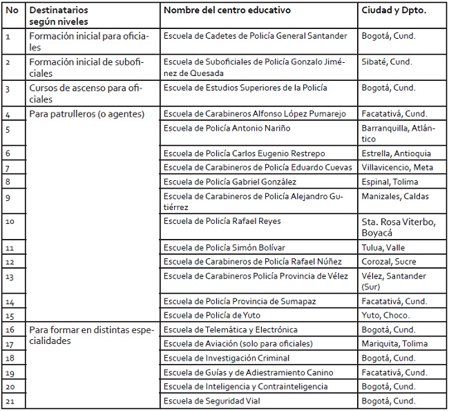 2.3 Centros educativos de la Dirección Nacional de Escuelas. El sistema está constituido por 21 escuelas, con las siguientes destinaciones principales: tres son exclusivamente para formación inicial, de ascensos y estudios de aviación para el nivel de oficiales; una para la formación inicial y ascensos de suboficiales; 12 para la formación inicial y cursos de ascenso para patrulleros (agentes o personal de vigilancia ordinaria) y cinco escuelas para cursos especiales a los que pueden acudir todos los grados (oficiales, suboficial y agentes). Esta clasificación se puede observar en la Tabla 2, con sus respectivos campos temáticos y destinatarios: