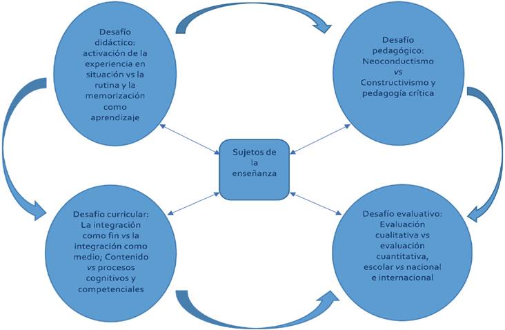 Los profesores frente a grupo están conminados a varios procesos. La activación de la experiencia docente detona el desafío de lo didáctico, el desafío pedagógico, el desafío curricular y el desafío evaluativo. En el primer desafío: integrar la didáctica a la experiencia en el movimiento de la vivencia y la activación de experiencia. En el desafío pedagógico: integrar la didáctica, los contenidos al método de proyecto, al enfoque problematizador, a las necesidades sociales del alumno; incluir la integración de las humanidades y las ciencias de la malla curricular. En torno al desafío de la evaluación, integrar las formas y procesos de las evaluaciones nacionales, extranjeras y locales, a las que cada profesor realiza y produce (véase Figura 3).