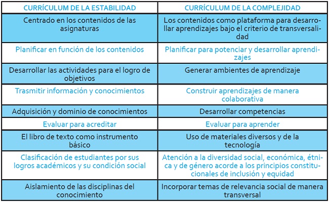 Está en el conocimiento escolar, el tránsito del conocimiento de las ciencias al conocimiento escolar. El paradigma de la complejidad se traslada a los planes de estudios, a los enfoques pedagógicos y a la interacción entre la práctica y la teoría, implicando al profesor en esta concepción. Se consolida la propuesta de la integración por medio de la noción de articulación, adjudicada también al sistema social y educativo. La modalidad comunicativa para llevarlo a la práctica y enlazarlo con la experiencia docente está en el uso de la metáfora (Villanueva, 2013).
