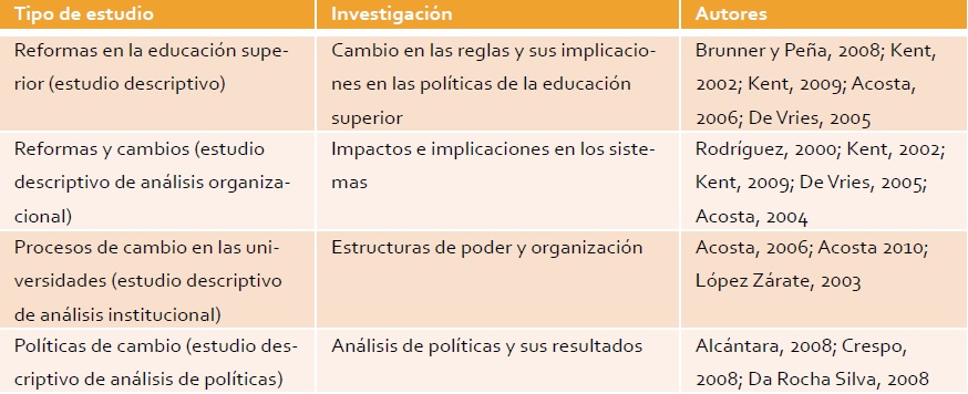 En el siguiente cuadro se resume lo que las investigaciones dan como conclusión y el enfoque utilizado para realizarlos, así como los autores que manejan los temas de cambio y procesos de reforma. Cabe aclarar que este tipo de investigaciones sirve de guía para tender un camino para conocer los procesos de cambio a lo largo de estas décadas en la ES. Sin embargo, existe una gran cantidad de investigación empírica que trata sobre los procesos de cambio en distintos espacios educativos.