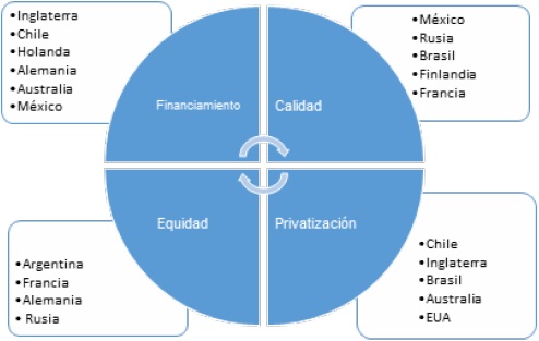 Las tendencias sobre la ES establecían que los sistemas educativos debían enfocarse en factores clave para el desarrollo económico de las regiones. Desde esta perspectiva, los estudios en el ámbito internacional sobre cambio y reformas presentan un panorama muy diverso de los senderos que toman los sistemas educativos. Si bien es cierto que la época de reformas comenzó en los años ochenta y noventa, en la actualidad se dan cambios en las distintas latitudes. La importancia de conocer hacia dónde se dirigen y cuáles son los motivantes del cambio genera la necesidad de estudiar el fenómeno. En este sentido, los procesos de cambio se forman según las tendencias globales educativas y encaminadas hacia cuatro ejes fundamentales que son: calidad, equidad, privatización y financiamiento (Altbach, Reisberg y Rumbley, 2009). En los estudios revisados sobre los procesos de cambio, las tendencias se posicionan en un cuadrante de análisis para ver el tipo de decisiones que tomaron los gobiernos y la forma en que las políticas inciden en la ES para crear nuevos escenarios.