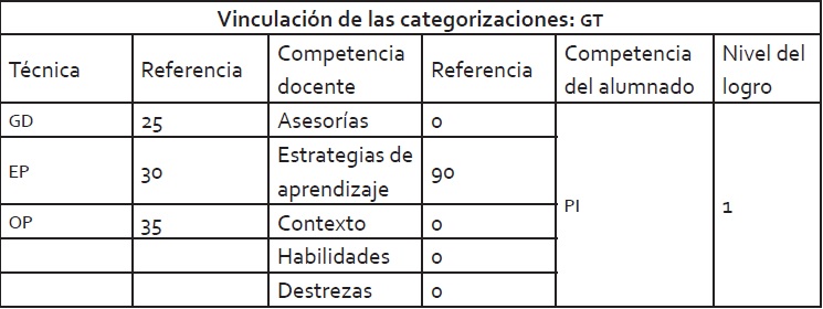 En las dos tablas siguientes se pueden ver los datos obtenidos de Aquad 7 para las referencias cruzadas entre las técnicas y las competencias docentes, la forma como propician para los grupos GT y GP el dominio de la competencia.