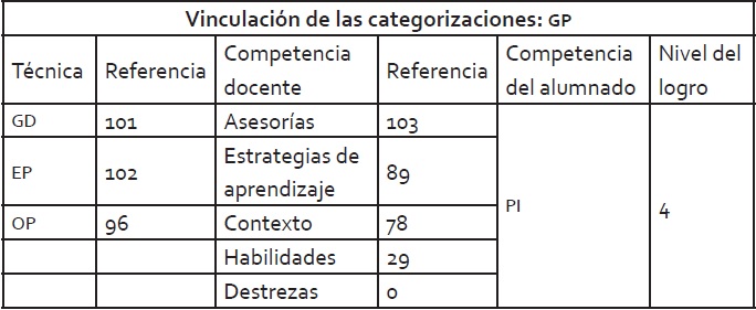 De acuerdo con Molina Martín, Iglesias García y Diego Pérez (2010), se ha construido la tabla anterior para poder determinar el logro de la competencia PI por parte del GT y GP, con los datos obtenidos de los GD, EP y OP, y analizados en Aquad 7, se ha podido determinar con mayor exactitud el nivel de dominio que ha alcanzado el alumnado para la realización de PI.