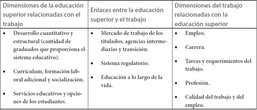 Antes de revisar las fuentes de información que dan cuenta de la inserción laboral de los universitarios en México, es importante identificar estos datos dentro de un marco más amplio acerca de la relación entre educación superior y mundo del trabajo. De forma analítica, Brenan et al. (1996) proponen tres dimensiones: una dimensión de la educación superior que es “relevante para el trabajo” (relevant to work), otra dimensión del trabajo que es “relevante para la educación superior” (relevant to higher education) y otra distinta en la que se analiza el cruce entre ambas dimensiones, “vínculos entre educación superior y trabajo” (linkages between higher education and work). En la Tabla 1 pueden observarse los componentes que integran cada una de las dimensiones y se puede identificar que, si bien se trata de una distinción analítica, la inserción laboral de los egresados se inscribe dentro de la dimensión del trabajo que está relacionada con la educación superior. Esto significaría que el acento en el análisis de la inserción debería ponerse desde el lado de la demanda, y no desde el lado de la oferta.