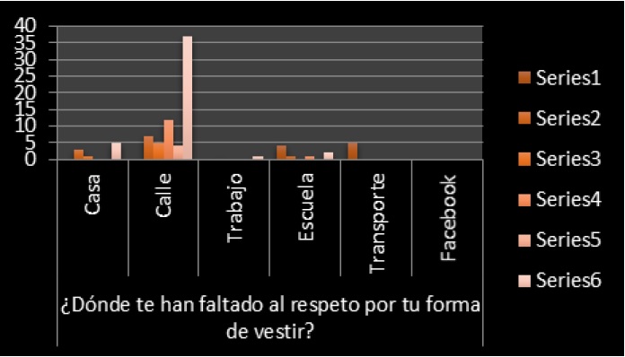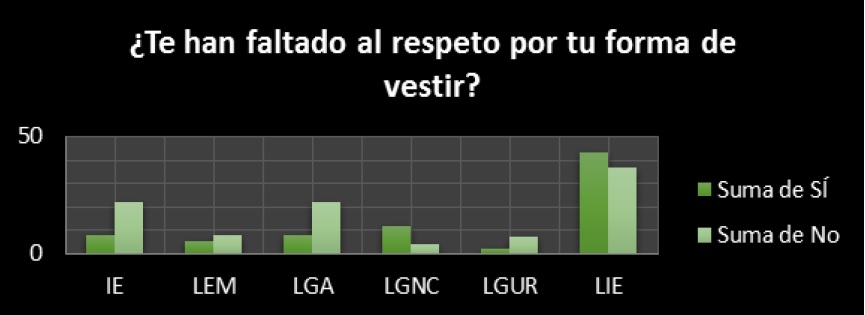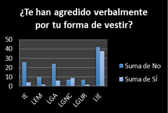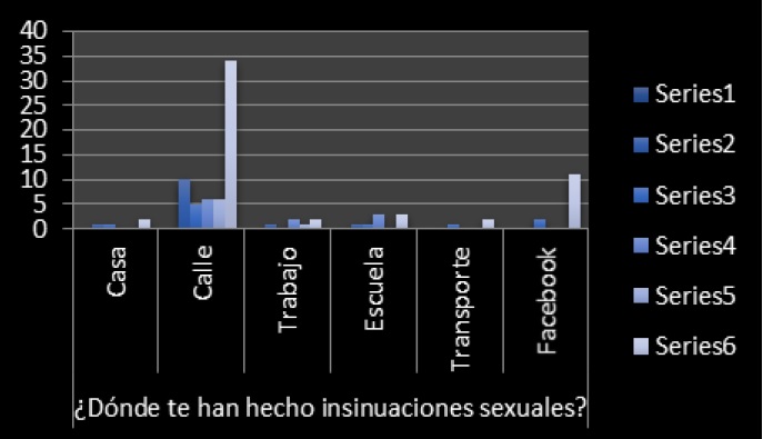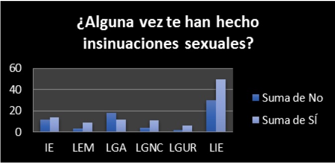 De igual manera, se les preguntó si alguna vez les han hecho insinuaciones sexuales y dónde, si les han tocado su cuerpo sin su consentimiento y si es así, quién y dónde; y finalmente se les preguntó cuáles son las palabras que más han recibido cuando les insultan.