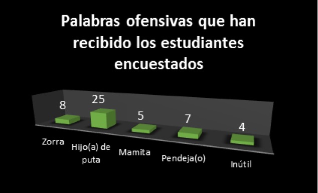 Se puede observar que son palabras muy agresivas, que denotan ofensa y lastiman a quienes las reciben, reduciendo su autoestima. No todos los estudiantes respondieron la pregunta, y el número de alumnos que ha recibido cada uno de estos términos inapropiados se muestra en cada una de las barras de la figura 8.