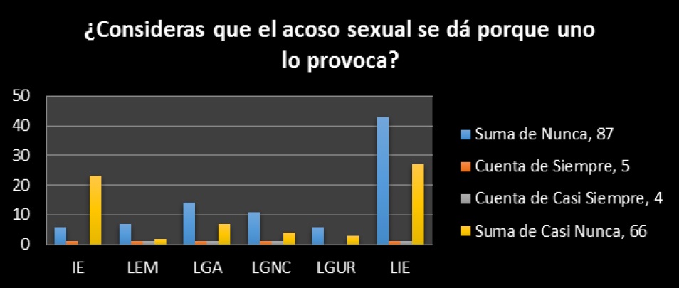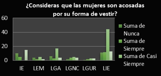 El hecho de que culturalmente la mujer sea un mero símbolo sexual para complacer los deseos sexuales del varón, pone de manifiesto que si la mujer se viste de determinada manera entonces lo hace para satisfacer ese deseo y la puede tomar, faltar al respeto y hacer con ella lo que le plazca, despersonalizándola; es decir, no la ven como un ser humano o sujeto de derechos, que puede vestir como ella lo desee sin que por ello que se le esté insinuando o que quiera que le falten al respeto (Figuras 5: media igual a 1, desviación estándar de 1.5, p=0.0380; Figura 6, con media de 10.1, desviación estándar de 13.8, p=0.19077; y Figura 7, con media de 1.3, desviación estándar de 1.5, y p=0.043), como se puede observar, los porcentajes no son menores: IE, con 53.33%; LEM, 79.92%; LGA, 46.67%; LGNC, 87.5%; LGUR, 88.89%; LIE, 62.5 %.