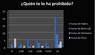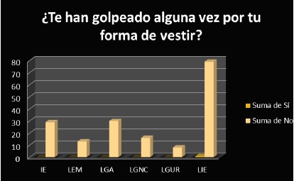 La cultura de violencia sexual hacia las mujeres u hombres con inclinaciones femeninas ocasiona que se perpetre no sólo la agresión verbal y psicológica, sino física por la manera de vestir, coartando así la libertad de elegir de manera libre lo que le gusta usar. El hecho de vestir provocativamente, según lo socialmente aceptado, es una de las situaciones por las cuales las mujeres siguen siendo culpables de ser acosadas y hostigadas sexualmente; en las figuras 14 (con media de 0.16, desviación estándar igual a 0.40, y p=0.038) y figura 15 (con media de 2.16, desviación estándar de 2.63, y p=0.1907) se muestra cuál fue el número de alumnos que ha sufrido golpes por la forma en que visten y quiénes han sido los agresores, así como quiénes les han prohibido elegir prendas que consideran inapropiadas. La representación simbólica y el concepto que se tiene sobre las mujeres y los hombres con tendencias femeninas de que son propiedad del hombre y que es dueño de sus cuerpos, le da no sólo el derecho sino el permiso social de golpearlas por ser mujeres que se exhiben a otros, y los otros de faltarles al respeto por ser mujeres u homosexuales.