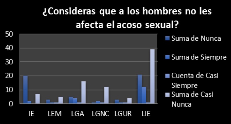 En cuanto a la pregunta sobre si a los hombres les afecta o no el hecho de ser acosados u hostigados sexualmente, la respuesta se generalizó en casi nunca, seguida de nunca, situación que sigue colocando a la mujer en desventaja debido a que ellas son las que reciben la mayor carga de acosos y hostigamientos, sin exentar que a los hombres también les suceda, pero lo ven más como algo que los beneficia en lugar de perjudicarlos, pues reafirma su machismo u hombría según su cultura: “mientras más mujeres se tenga más hombre se es, y si alguien los acosa es parte de ello, pues al final los hombres no tienen nada que perder y las mujeres todo”, según un estudiante de 19 años.