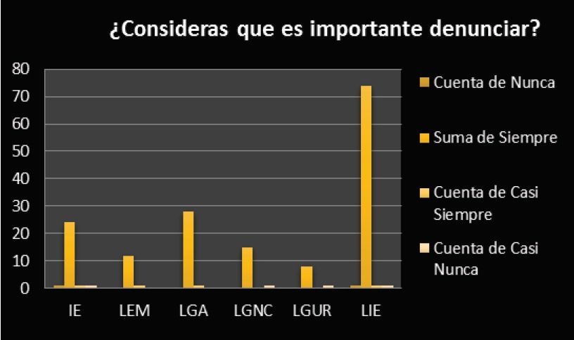 Y finalmente se les preguntó si consideraban importante que se denunciara. La mayoría de los estudiantes estuvo a favor de denunciar, en una relación directa entre el propio conocimiento del hostigamiento y acoso sexual, así como de las experiencias cercanas o propias (Figura 16, cuya media aritmética es de 26.8, desviación estándar de 24.28, y p=0.3418, para “suma de siempre”).
