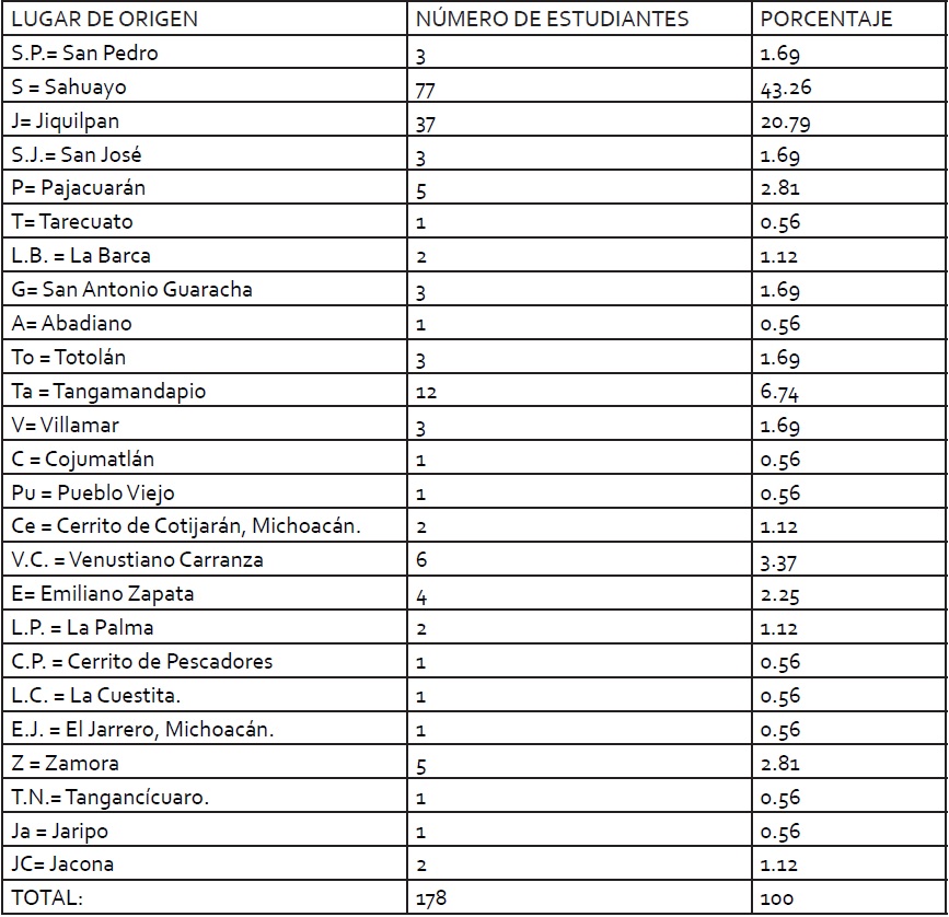Como se muestra más adelante en la Tabla 1, los lugares de procedencia de los estudiantes encuestados corresponden a la región Lerma-Chapala del estado de Michoacán.