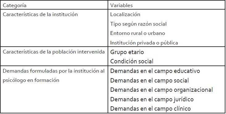 Después de la lectura de 15 proyectos de prácticas elegidos al azar, se establecieron tres categorías para la sistematización de la información en una matriz. Se determinaron en cada categoría unas variables, cuya selección dependió de la información contenida en los proyectos e informes finales, limitada por los datos que solicita el formato establecido por la universidad para tal fin. Las variables se organizaron según las categorías como se observa en la tabla 1.