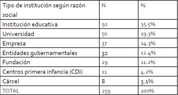 Tipo según razón social. A partir del análisis que se realizó de la variable “agencia de práctica” se identificaron las instituciones donde los estudiantes realizaron su práctica profesional, para realizar una caracterización a partir de su razón social, que se refiere al vínculo entre “el nombre de una empresa con el desarrollo de iniciativas de diversa índole dirigidas al entorno social en el que ésta se halla inserta” (Roitter, 1996: 8); éstas fueron: institución educativa, universidad, organización empresarial, cárcel, fundación, entidades gubernamentales y Centros de Desarrollo Infantil (CDI).