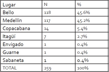Lugar. Como se observa en la tabla 3, los municipios donde están situadas las agencias de práctica profesional pertenecen en su mayoría al Valle de Aburrá, pero ninguna de ellas está localizada por fuera del departamento de Antioquia. Se identificó a Bello (45.6%) como el lugar donde se encuentran la mayor parte de agencias de práctica, lo que va en relación con la presencia de la acción institucional en el sector donde se encuentra ubicada. En este caso la Corporación Universitaria Minuto de Dios tiene la sede de Antioquia y Eje Cafetero en el municipio de Bello, lo que da cuenta de la presencia de sus estudiantes en el sector. En Medellín están localizadas aproximadamente el mismo número de agencias (45.2%) que en el municipio de Bello. Con menor frecuencia de aparición están el municipio de Copacabana (5.4%) e Itagüí (2.7%), y con un porcentaje más bajo Sabaneta, Envigado y Guarne (0.4%).