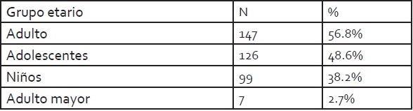 Grupo etario. Para contabilizar esta variable se tomó en consideración que en cada proyecto de práctica se pueden hallar intervenciones que atienden a varios grupos poblacionales, razón por la cual los porcentajes arrojados fueron tomados con base en el total de unidades documentales (259).