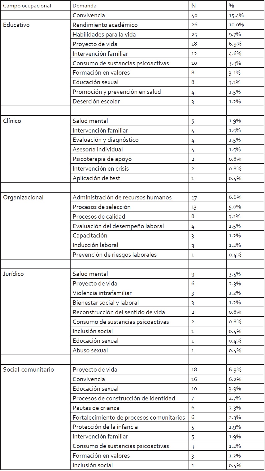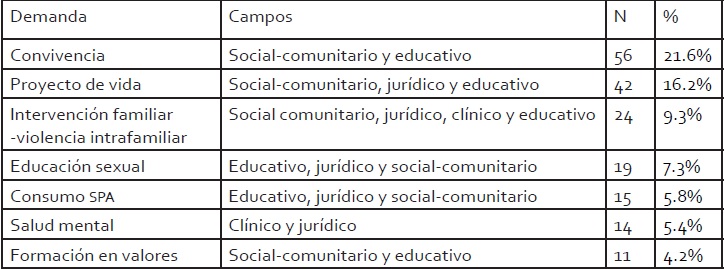 Se encontró que algunas demandas son comunes a diversos campos ocupacionales (tabla 8), y su frecuencia alta de aparición en los proyectos e informes finales muestra la prioridad que tienen dichas demandas en el contexto: convivencia, proyecto de vida, intervención familiar, violencia intrafamiliar, educación sexual, consumo SPA, salud mental, formación en valores.