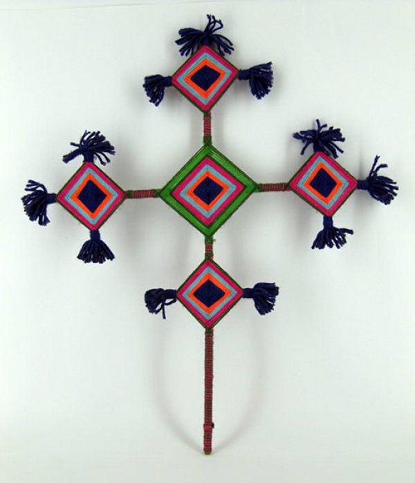 Fuente: Informe final de la Consulta sobre lugares sagrados del pueblo wixárika (CDI, 2010, p.16).Título: HUI 102. Técnica: Ojo de Dios. Carrizo forrado de estambre