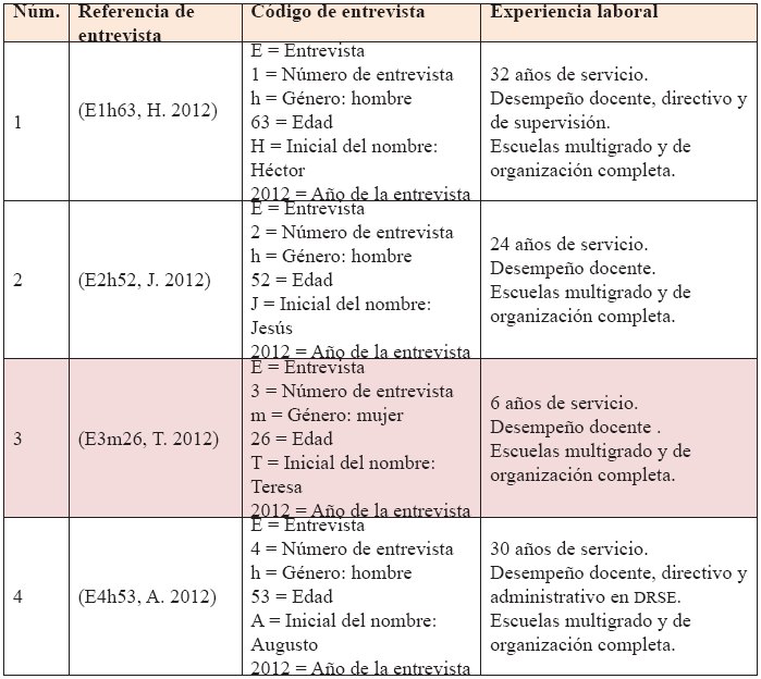 Con la selección de informantes se inicia un nuevo proceso cuyo propósito es dar cuenta de la formación profesional de docentes wixaritari a través de las narrativas de los sujetos de estudio. En la tabla 1 se enlistan las siete entrevistas que se realizaron como parte de esta investigación; la tabla consta de cuatro columnas, la primera contiene el número progresivo y señala el orden cronológico de aplicación; la segunda muestra el código de la entrevista que se utiliza como referencia; la tercera describe el significado del código; y la cuarta ofrece datos de antigüedad y experiencia laboral.