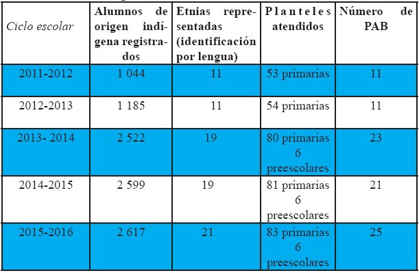 No obstante, los avances manifestados, la finalización del sexenio estatal en el cual se impulsó esta intervención educativa ocasionó un cambio toral en el proceso. La política del nuevo gobierno, a partir de octubre de 2003, focalizó la estrategia a las escuelas primarias, al tiempo que limitó el servicio que se había empezado a ofrecer a los preescolares; asimismo, suspendió el seguimiento que se hacía a los alumnos indígenas inscritos en secundaria (Vidales et al., 2007:104). En cuanto al DEI, además del cambio en su administración (febrero de 2004) pasó a depender de la Dirección de Educación Primaria.