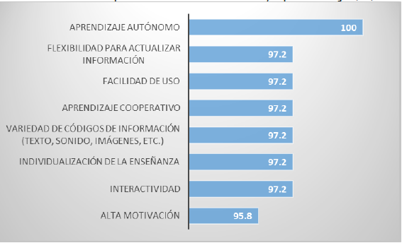 Un dato importante para reflexionar es que 100% de los docentes consideró que las TIC son un recurso importante para mejorar la enseñanza. En este mismo sentido se les preguntó su valoración sobre ocho características de las tecnologías que pueden ayudar a la modificación de los procesos de enseñanza y aprendizaje, las respuestas se presentan en el gráfico 2.