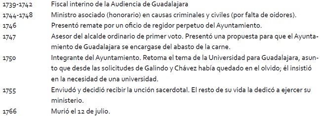 En 1713 fue designado como Abogado en el Juzgado de Bienes de Difuntos y cuatro años más tarde figura en los libros de cabildo como Alcalde ordinario de Guadalajara, además de ejercer su profesión de manera particular. Cabe aclarar que a pesar de ello, jamás desatendió la confección de proyectos en aras de la modernidad, desarrollo, urbanismo y salubridad de la ciudad.