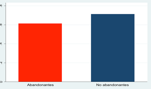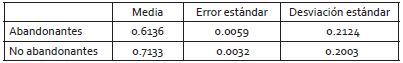 Se realizó una prueba de diferencia de medias en donde se muestra que la distribución de los datos es normal y que la diferencia de medias entre abandonantes y no abandonantes es distinta de cero, por lo cual las estimaciones son estadísticamente significativas. A continuación, se muestran algunos estadísticos descriptivos de los resultados.