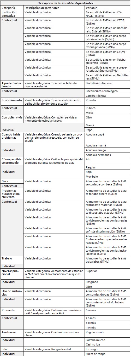 Para la selección de variables se consideraron dos criterios: 1) que pudieran integrarse en uno de los dos factores analizados, ya sean los de carácter contextual o individual, y 2) que estuvieran presentes en la fuente de información, la ENDEMS (2012). Cabe resaltar que, por ser una encuesta enfocada a los estudiantes, la mayoría de las preguntas están orientadas al individuo, aunque sí hay elementos suficientes para hacer una categorización contextual.