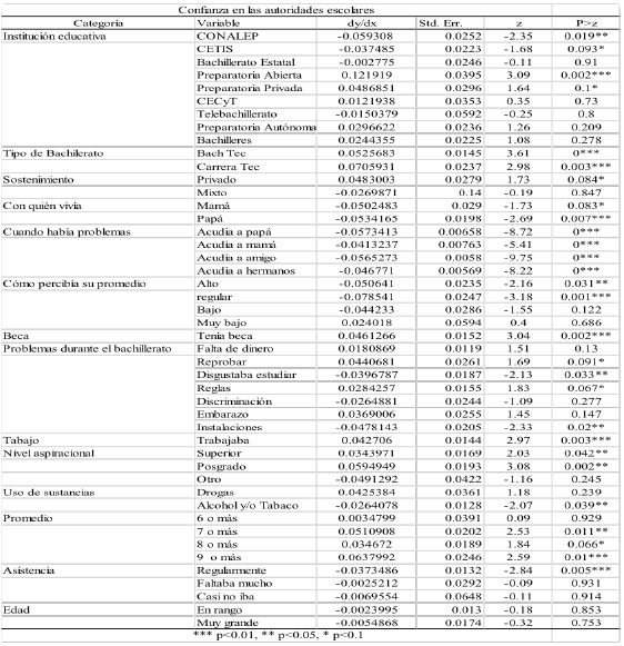 La lectura de las categorías se realiza a partir de los valores dx/dy, los cuales representan el cambio en la probabilidad de resultado = 1 asociado con un aumento de unidad en las variables independientes correspondientes, lo cual se interpreta como la afectación (negativa o positiva) en la probabilidad de que ocurra un evento, en este caso la confianza en las autoridades, tomado como referencia una variable explicativa y manteniendo constantes las demás.