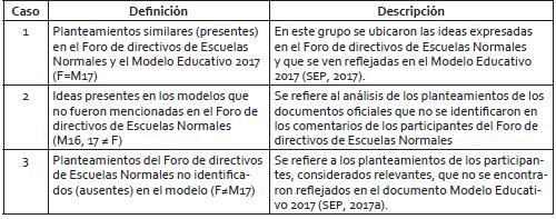 Al realizar el análisis de la relación entre los planteamientos de los participantes en el Foro de directivos y las categorías derivadas de las ideas principales en el Modelo Educativo 2016 y el Modelo Educativo 2017, se encontró que los resultados podían organizarse en tres casos, los cuales se describen en la Tabla 1.