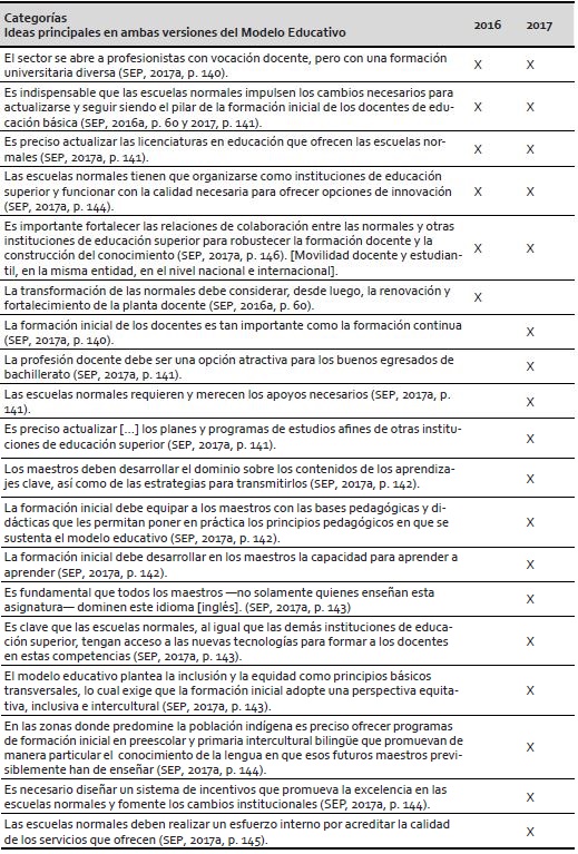 En la Tabla 2 se presentan las similitudes y diferencias identificadas en las ideas principales de las dos versiones del Modelo Educativo. En la primera columna se exponen las categorías, mientras que en la segunda y tercera columna se especifica con una “X” si la categoría se encontró en el Modelo Educativo 2016, en el de 2017, o en ambos.