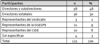 En las diez mesas de trabajo se contó con la participación de 122 integrantes.3 Como se indica en el nombre del foro, este estuvo integrado por directivos de escuelas normales de las distintas entidades del país. En la Tabla 3 se presenta la distribución de los participantes de acuerdo a su cargo.
