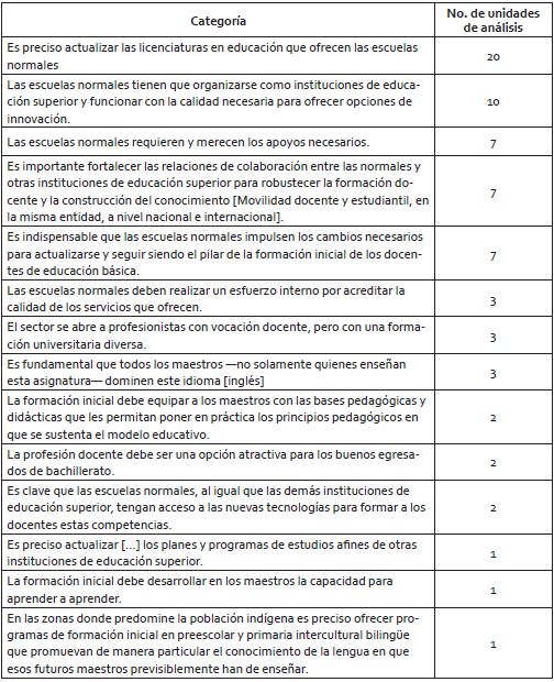 Como se observa en la Tabla 4, la unidad de análisis más recurrente, mencionada por los participantes, fue la actualización de las licenciaturas en educación que ofrecen las escuelas normales (SEP, 2017a). Al respecto, uno de los participantes precisó: