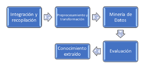 La primera fase del proceso KDD es la integración y recopilación de datos, en la cual se determinan las fuentes de información y la manera de conseguirlas para formar la base de datos a utilizar. La siguiente fase es el procesamiento, en donde se realiza la selección de los datos más relevantes para el estudio y la limpieza de datos para eliminar problemas tales como datos erróneos o faltantes. En la transformación de los datos se convierten a una representación que sea manejable para la técnica de minería de datos seleccionada (Hernández et al., 2004). Posteriormente, se encuentra la fase de minería de datos, en la que define el algoritmo de minería de datos a implementar. Finalmente está la fase de evaluación, en la cual se determina la validez y confiabilidad de los patrones obtenidos que representan el conocimiento extraído.